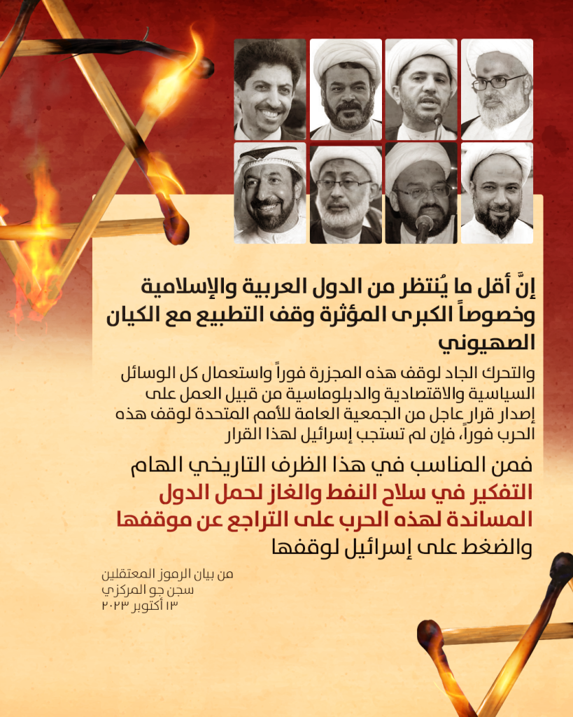 الشيخ علي سلمان والرموز المعتقلون في البحرين من سجنهم: ما يجري في غزة عارٌ لن يُغسل عن مرتكبيه والمحرضين عليه