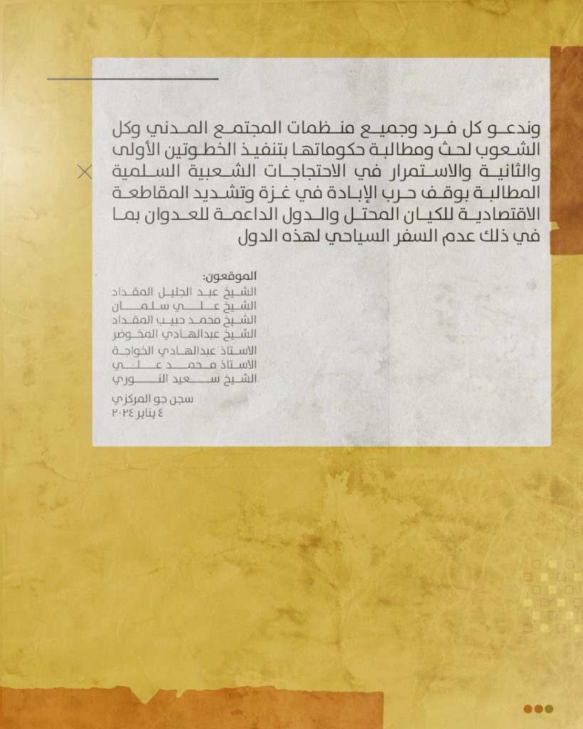 وندعو كل فرد وجميع منظمات المجتمع المدني وكل الشعوب لحث ومطالبة حكوماتها بتنفيذ الخطوتين الأولى والثانية والاستمرار في الاحتجاجات الشعبية السلمية المطالبة بوقف حرب الإبادة في غزة وتشديد المقاطعة الاقتصادية للكيان المحتل والدول الداعمة للعدوان بما في ذلك عدم السفر السياحي لهذه الدول.