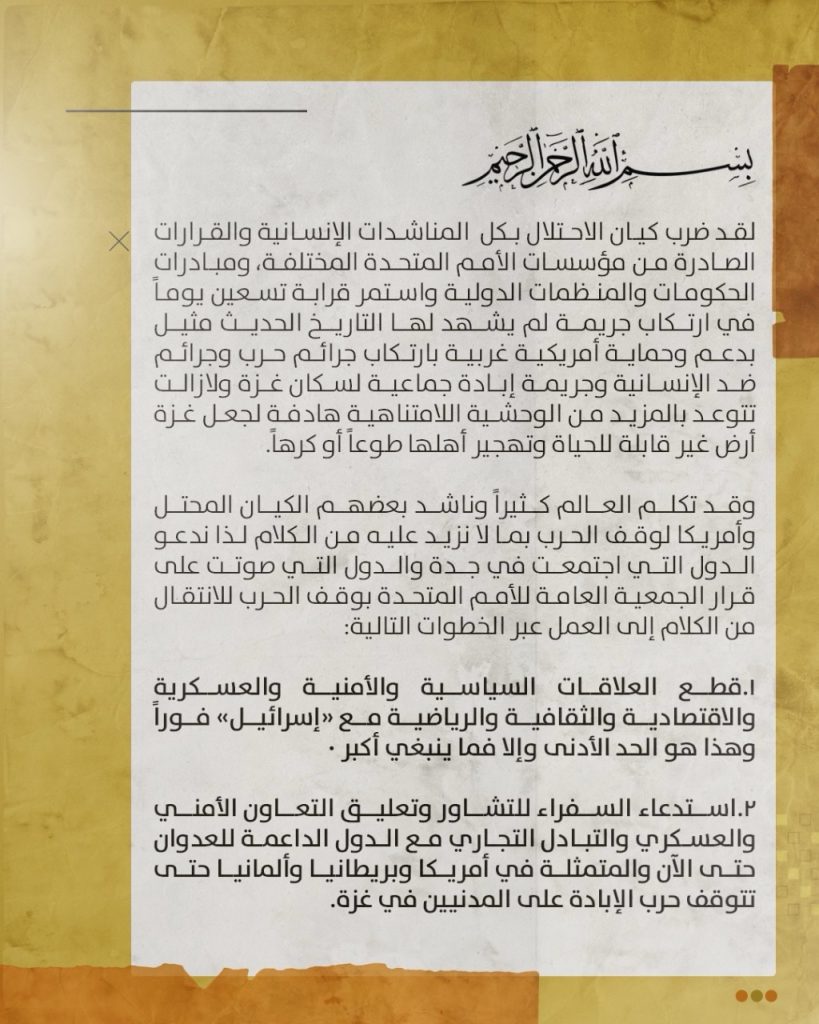 وقد تكلم العالم كثيراً وناشد بعضهم الكيان المحتل وأمريكا لوقف الحرب بما لا نزيد عليه من الكلام لذا ندعو الدول التي اجتمعت في جدة والدول التي صوتت على قرار الجمعية العامة للأمم المتحدة بوقف الحرب للانتقال من الكلام إلى العمل عبر الخطوات التالية:
