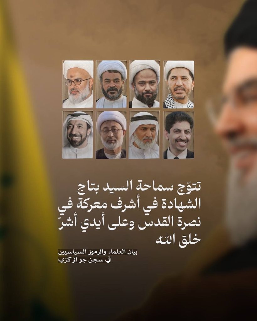 العلماء والرموز السياسيون في سجن جو المركزي: تتوّج سماحة السيد نصر الله بتاج الشهادة في أشرف معركة في نصرة القدس، وعلى أيدي أشر خلق الله، فنبارك له بالشهادة ونعزي الأمة الإسلامية برحيل هذا البطل