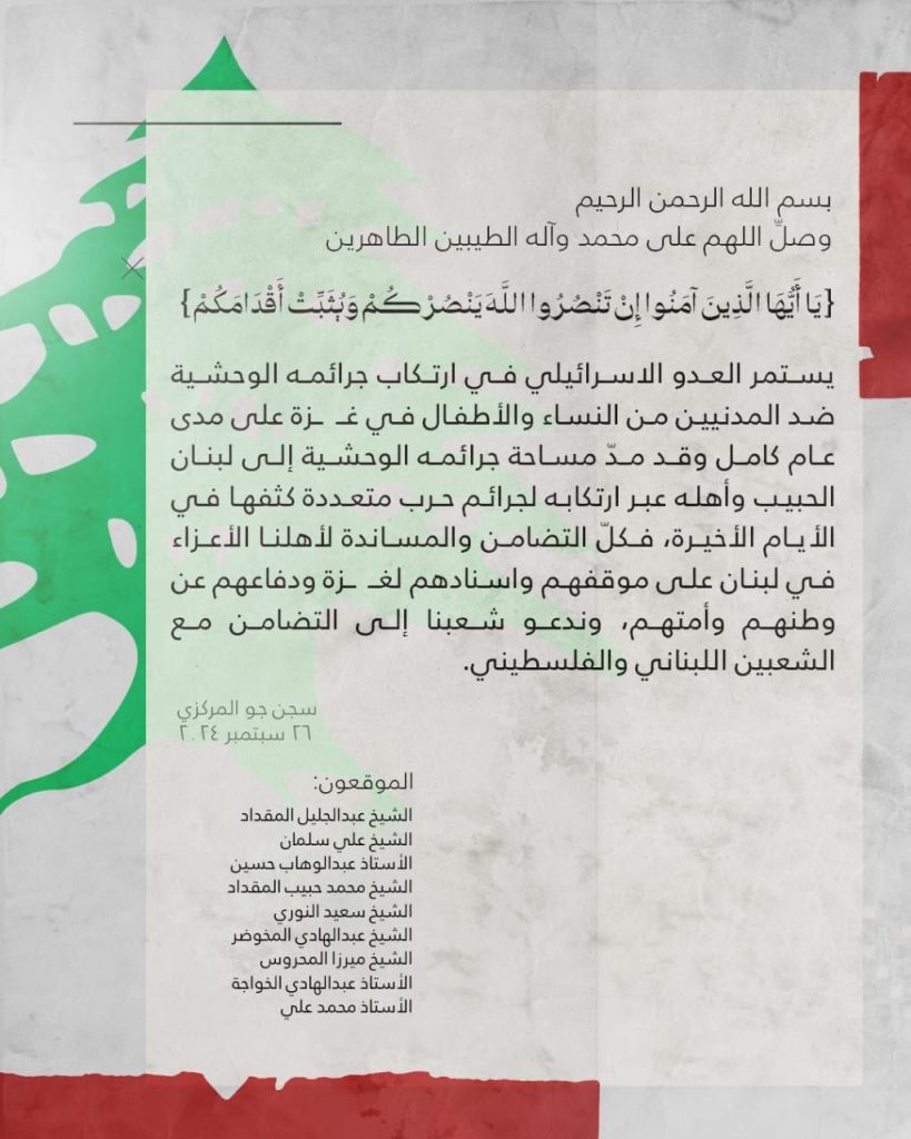 يستمر العدو الاسرائيلي في ارتكاب جرائمه الوحشية ضد المدنيين من النساء والأطفال في غزة على مدى عام كامل وقد مدّ مساحة جرائمه الوحشية إلى لبنان الحبيب وأهله عبر ارتكابه لجرائم حرب متعددة كثفها في الأيام الأخيرة، فكلّ التضامن والمساندة لأهلنا الأعزاء في لبنان على موقفهم واسنادهم لغزة ودفاعهم عن وطنهم وأمتهم، وندعو شعبنا إلى التضامن مع الشعبين اللبناني والفلسطيني.