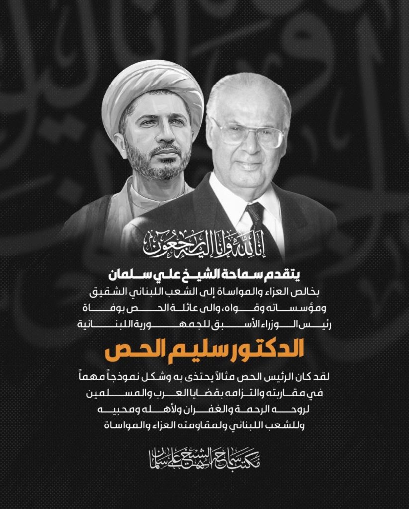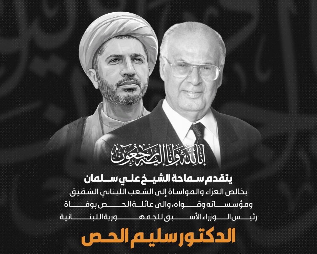 يتقدم سماحة الشيخ علي سلمان بخالص العزاء والمواساة إلى الشعب اللبناني الشقيق ومؤسساته وقواه، والى عائلة الحص بوفاة رئيس الوزراء الأسبق للجمهورية اللبنانية الدكتور سليم الحص .
